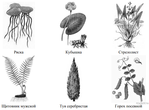 Рассмотрите изображения шести представителей мира растений. Предложите основание, согласно которому их можно разделить на две группы — по три представителя в каждой.