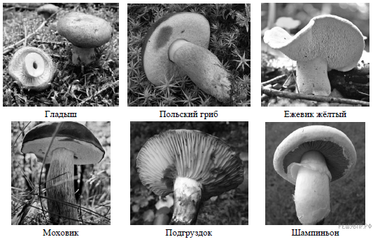 Рассмотрите изображения шести представителей мира грибов. Предложите основание, согласно которому эти грибы можно разделить на две группы по три представителя в каждой.
