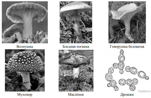 Рассмотрите изображения шести представителей мира грибов. Предложите основание, согласно которому их можно разделить на две группы по три представителя в каждой.